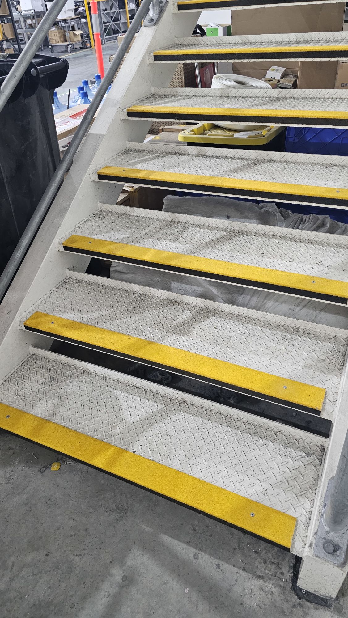 We install highlighted non slip stair nosing to warehouse stairs to reduce slips and maintain compliance.